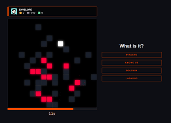 In Pix Reveal a pixel art gets revealed one pixel at a time. You have 15 seconds to choose the right out of 4 answers. The faster you answer, the more points you earn. You can play online against your friends to see who can make the most right guesses the fastest.